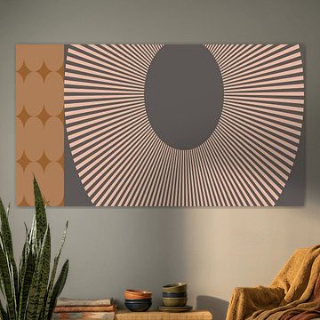 Woonkamer met terracotta bank, kleurrijke wandkunst en roze gestreept behang