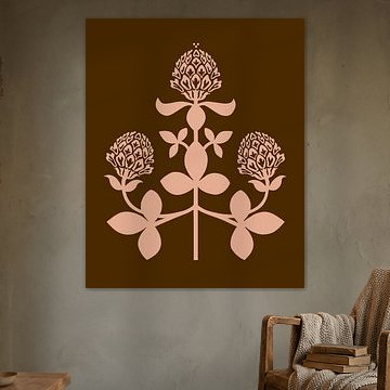 Woonkamer met terracotta bank, kleurrijke wandkunst en roze gestreept behang