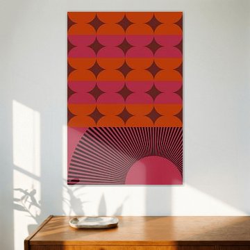 Woonkamer met terracotta bank, kleurrijke wandkunst en roze gestreept behang