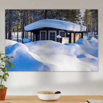 Landschap met sneeuw en houten hut in de winter in Kuusamo, Finnl Rico Ködder