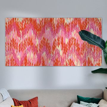 Woonkamer met terracotta bank, kleurrijke wandkunst en roze gestreept behang