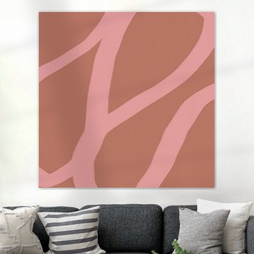 Woonkamer met terracotta bank, kleurrijke wandkunst en roze gestreept behang