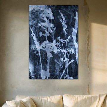 Abstract Botanisch. Bloemen, planten en grassen in licht- en donkerblauw en zwart Dina Dankers