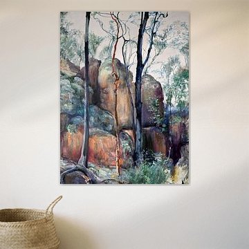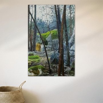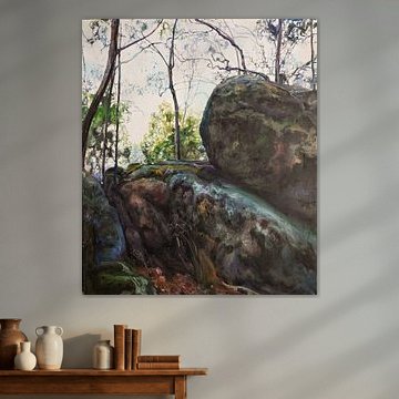 Van hier, mijn omgeving, bron ik mijn onderwerpen, een bos, een groep bomen sommige rotsen de bladeren op de grond de gezichten die ik zie.