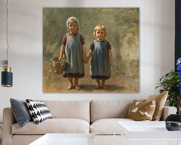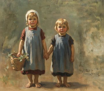 Twee kleine meisjes die een mand dragen, vrij naar Jozef Israëls