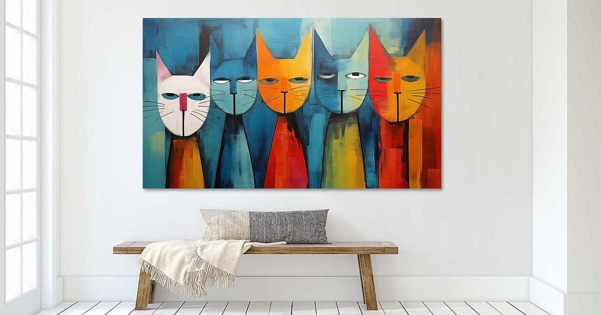Hun werken variëren van abstracte ontwerpen zoals "Abstracte boze katten kleurrijk panorama" en "Kleurrijke blokken abstract panorama" tot meer gedetailleerde en specifieke onderwerpen zoals "Champagne glazen splash" en "Kleurrijke iris oog panorama". Elk stuk is met zorg ontworpen om stijl en sfeer toe te voegen aan elke ruimte.