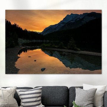 Weerspiegeling van bergen met sneeuw in Moose Lake, Canada van Fotograaf Remco