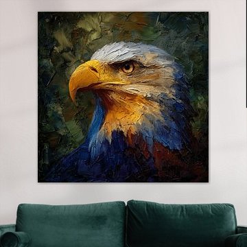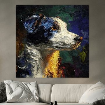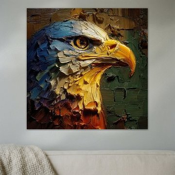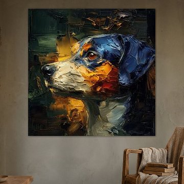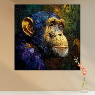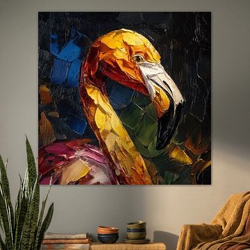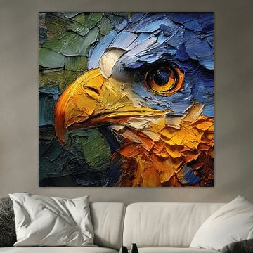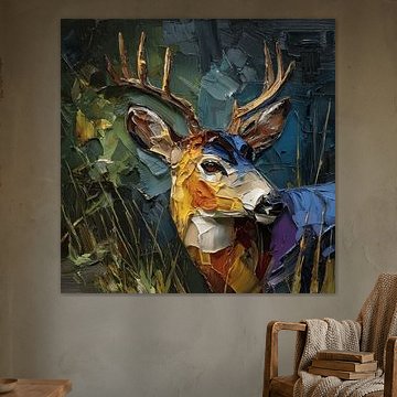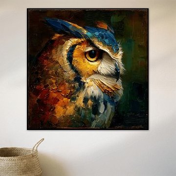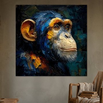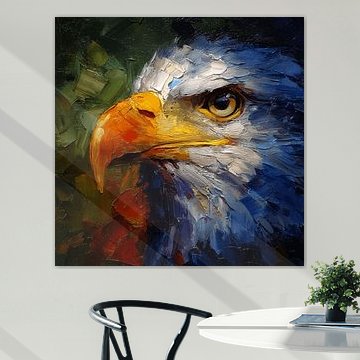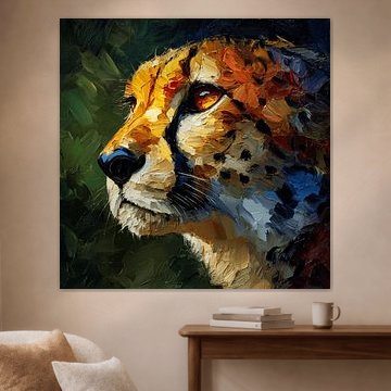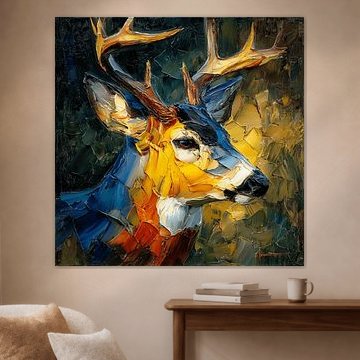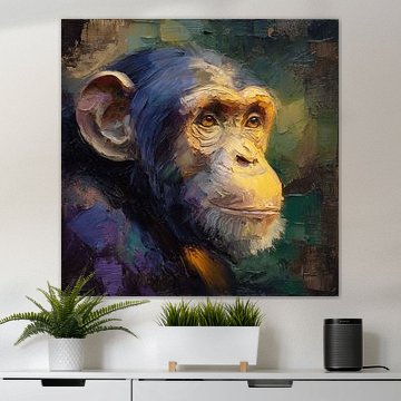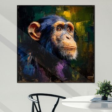 Hang een abstract portret op ooghoogte in een rustige hoek waar je de details kunt bekijken zonder afleiding. De gelaagde verfstreken en verborgen gezichtstrekken komen het beste tot hun recht bij natuurlijk licht, zoals bij Creative Thought met zijn krachtige kleurmengelingen.