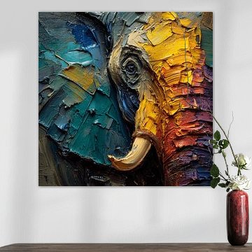 Hang een abstract portret op ooghoogte in een rustige hoek waar je de details kunt bekijken zonder afleiding. De gelaagde verfstreken en verborgen gezichtstrekken komen het beste tot hun recht bij natuurlijk licht, zoals bij Creative Thought met zijn krachtige kleurmengelingen.