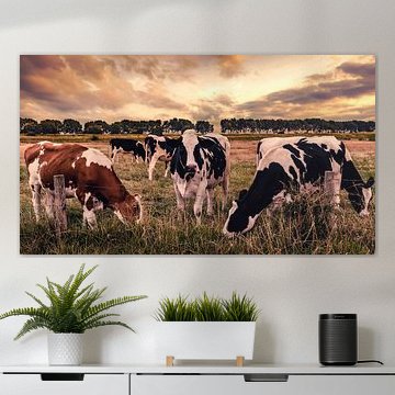 Op zoek naar gezellige koeien wanddecoratie? Koop hier vrolijke en kleurrijke koe schilderijen, of rustgevende fotokunst van koeien in de wei. Deze prachtige landelijke wanddecoratie is veelzijdig en kan bij elk interieur en stijl terecht. Landelijke fotografie en schilderijen van koeien kopen kan bij ons op maat, en op hoogwaardige materialen. Denk aan indrukwekkend fotobehang met koeien in de stal, of kleurrijke koe schilderijen op akoestisch doek om de galm in huis te verminderen.