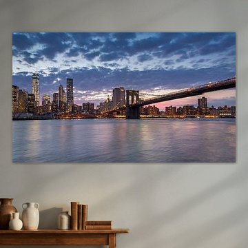 Lower Manhattan Skyline in New York in de avond met Brooklyn Bridge op de voorgrond van Merijn van der Vliet