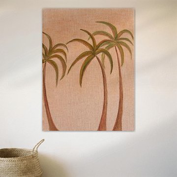 De collectie Palmbomen brengt een ontspannen sfeer in huis met natuurlijke tinten. Blauw en beige werken uitstekend in een Scandinavische woonstijl, waar je beide kleuren combineert met lichte houtaccenten en witte muren. Voor een bohemien interieur kies je juist voor de warmere tinten: bruin, taupe en olijfgroen creëren samen een gelaagde, warme uitstraling. Hang een palm in beige- en bruintinten boven een rotan fauteuil of combineer meerdere werken in verschillende formaten voor extra diepte.