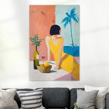 Een kunstwerk met meerdere kleuren komt het beste tot zijn recht tegen een rustige achtergrond. Hang Kleurrijk, modern en abstract portret op een witte of lichtgrijze muur, zodat de roze, terracotta en saliegroen volop opvallen. Deze aanpak werkt uitstekend in moderne interieurs waar je één blikvanger wilt creëren.