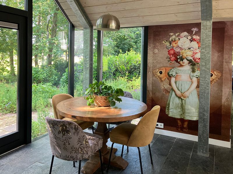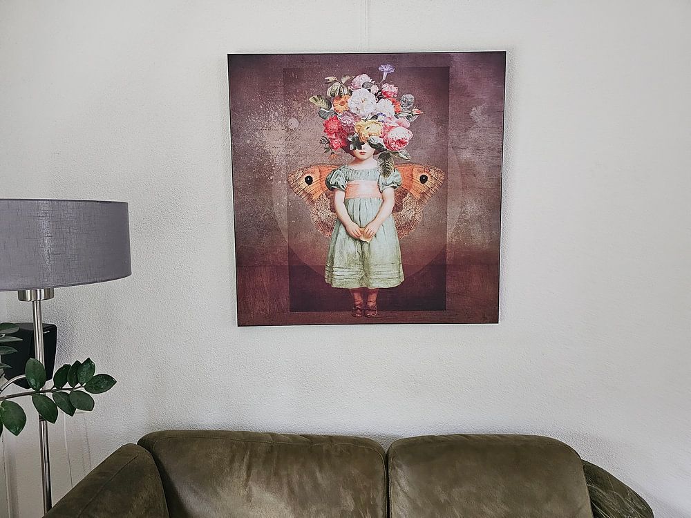 Kunstwerken met een mysterieuze sfeer komen het beste tot hun recht op ooghoogte, zodat je de details goed kunt zien. Hang ze bij voorkeur op een plek waar je even stil kunt staan, zoals in de gang of bij de trap. Een mooi voorbeeld is Whispers of the Past, waar je de bijzondere bloemencollage pas echt ziet als je er dichtbij staat.