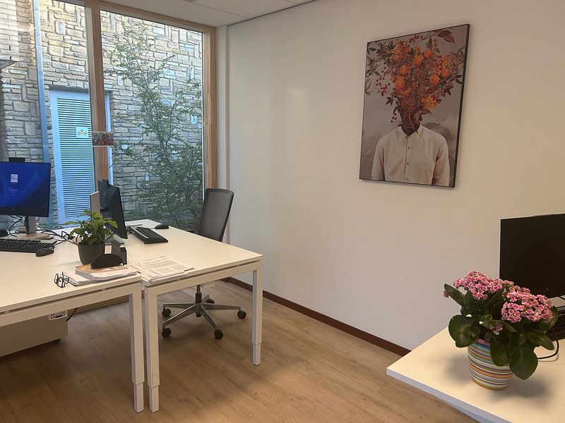 Oranje en terracotta kleuren vragen om natuurlijke accenten in je ruimte. Voeg textiel in zandtinten of warmbruin toe, of kies voor houten meubels die de warmte versterken. De zachte kleurovergang in Abstract portret werkt mooi samen met rotan of linnen accessoires voor een rustige uitstraling.