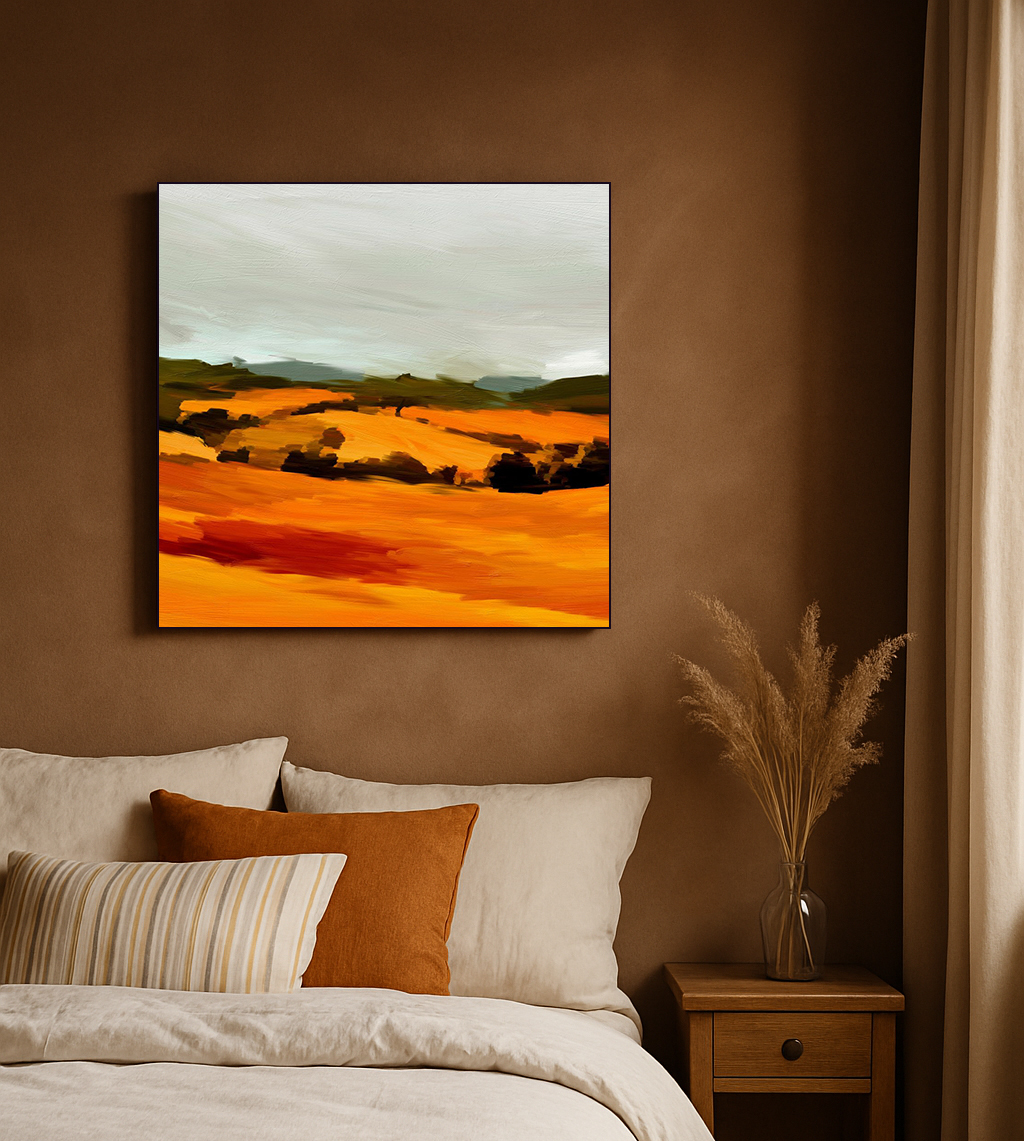 De woonkamer is een goede plek voor Tangerine Twist Werk aan de Muur 2026, vooral als je op zoek bent naar een warme, uitnodigende sfeer. De bruine, oranje en terracotta tinten combineren mooi met natuurlijke materialen zoals hout en rotan, maar ook met donkere meubels die contrast geven. Hang een werk boven de bank of plaats het op een plank naast decoratieve objecten in dezelfde kleurenfamilie. Door de levendige maar ook rustige uitstraling past deze collectie goed in ruimtes waar je zowel ontspant als gasten ontvangt.