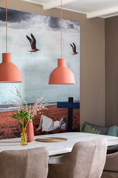 Krachtige collagewerken met felle kleuraccenten stimuleren creativiteit en energie. Hang IN ORDER in een thuiskantoor of atelier waar je productief wilt blijven. De levendige mix van rood, oranje en blauw houdt je alert zonder afleidend te werken tijdens lange werkdagen.