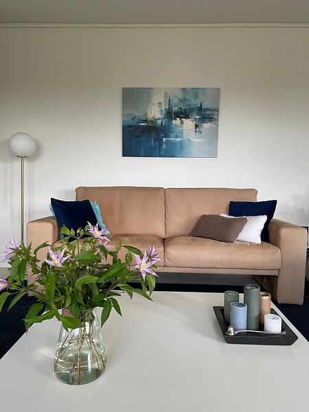 Fotografie met zachte zonsondergangkleuren verzacht een strakke, moderne inrichting. Combineer de brons- en petrolnuances uit Rotterdam Skyline in the morning (Landscape) met warme accessoires zoals koperkleurige lampen of terracotta kussens. Zo creëer je een aangename sfeer zonder dat het te koel aanvoelt.