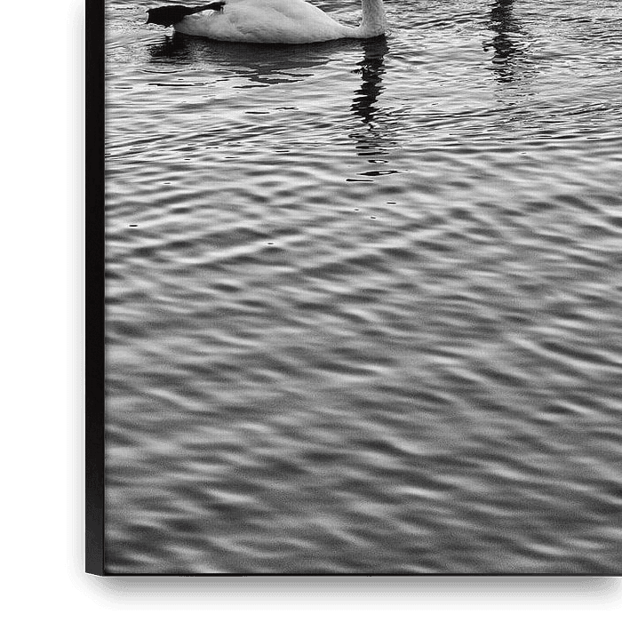 10 zwanen drijven statig op het water. De grote vogels drijven rustig met de stroom mee. De opname is omgezet naar zwart-wit.