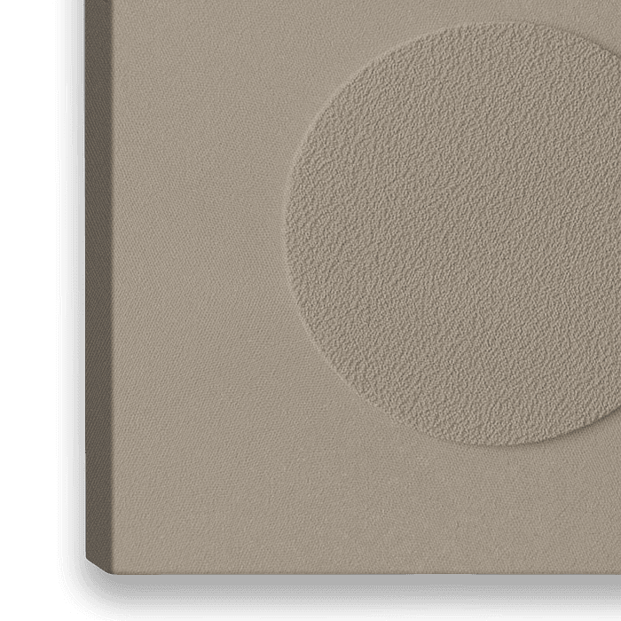 Kenmerken zijn de herhaling van geometrische vormen (cirkels en vierkanten), het gebruik van een uniforme warme taupekleur en een focus op de textuur en de…