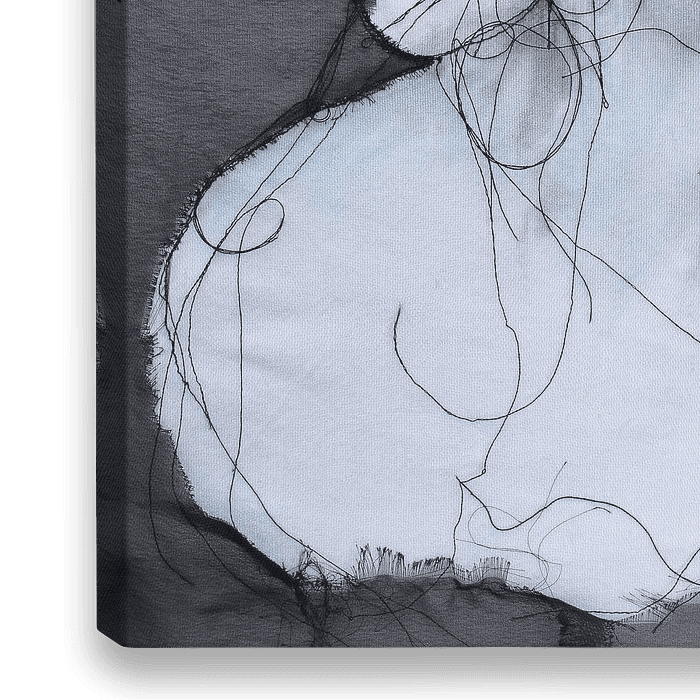 Een figuratief zwart-wit werk , een klassiek beeld . Een portret van een vrouw, zwart draad en textiel op wit doek. Het zwart en wit in evenwicht & harmonie,