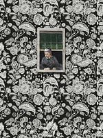 Dit opvallende kunstwerk combineert een klassiek figuratief tafereel met een gedurfd, botanisch decoratief design.