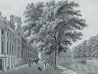 tekening van een stads gezicht naar Cornelis de Kruyff. tussen de Spiegelgracht en de Vijzelstraat.
