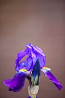 Een paarse Iris, nu eens een keer geen bloem in het midden maar aan de onderzijde. Contrasteert met de de aarde tinten in de achtergrond.