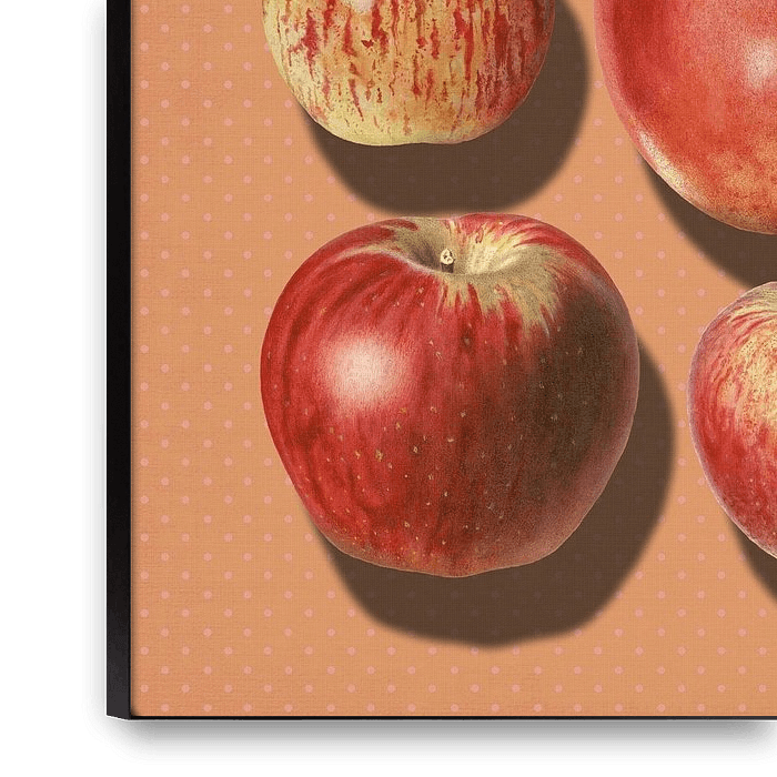 Collage van 9 sappige appeltjes op zalmroze achtergrond.