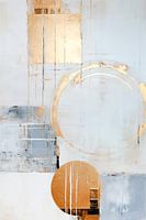 Moderne kunst met gouden geometrische vormen, waaronder cirkels en lijnen, steken af tegen een gedempte, abstracte achtergrond. Het ontwerp heeft een minimalistische esthetiek met een mix van metallic glans en zachte neutrale tinten. Dit abstracte schilderij straalt een tijdloze, contemplatieve rust uit. De kleuren smelten samen tot een…