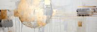 Moderne kunst met goudkleurige vormen, gedempte contrasten en een textuur in lichtgrijze tinten. Dit abstracte schilderij in panoramisch formaat straalt een tijdloze, contemplatieve rust uit. De kleuren smelten samen tot een harmonieuze compositie.