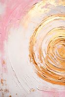 Minimalistische kunst met gouden cirkels en een textuur in lichtroze en wit. Het abstracte ontwerp is bedoeld om een ontspannen sfeer te creëren. De kleur creëert een geweldig binnenklimaat en helpt ons innerlijke rust en sereniteit te vinden.