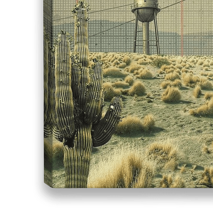 "ARTIFICIAL OASIS" toont een surrealistische scène vastgelegd in de vergeelde tinten van een oude foto. Midden in een uitgestrekte, uitgedroogde woestijn ligt een verkoelend aquablauw zwembad, omringd door cactussen en droog gras. Op de achtergrond doemen wazige bergen op die diepte toevoegen aan het landschap, terwijl een verroeste…