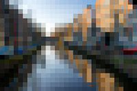 Aan de Amsterdamse grachten. Abstractie in pixels van een foto gemaakt aan een Amsterdamse gracht. Grote blokken. Zo ontstaat een universeel beeld van grachtenpanden aan het water, met een brug.