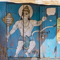 In India tref je veel prachtig doorleefde deuren aan. Soms verveloos in puur doorleefd hout, soms beschilderd in felle kleuren zoals deze die een afbeelding van de aap god 'Hanuman' heeft meegekregen.