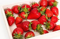 Aantal rode aardbeien in een wit kratje op witte achtergrond