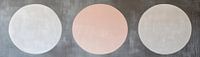 Abstract Drie Cirkels - Dit abstracte schilderij toont drie grote cirkels op een gestructureerde grijze achtergrond, waarbij de middelste cirkel in een zachte roze tint is gekleurd tegenover de witte tinten van de andere twee cirkels.