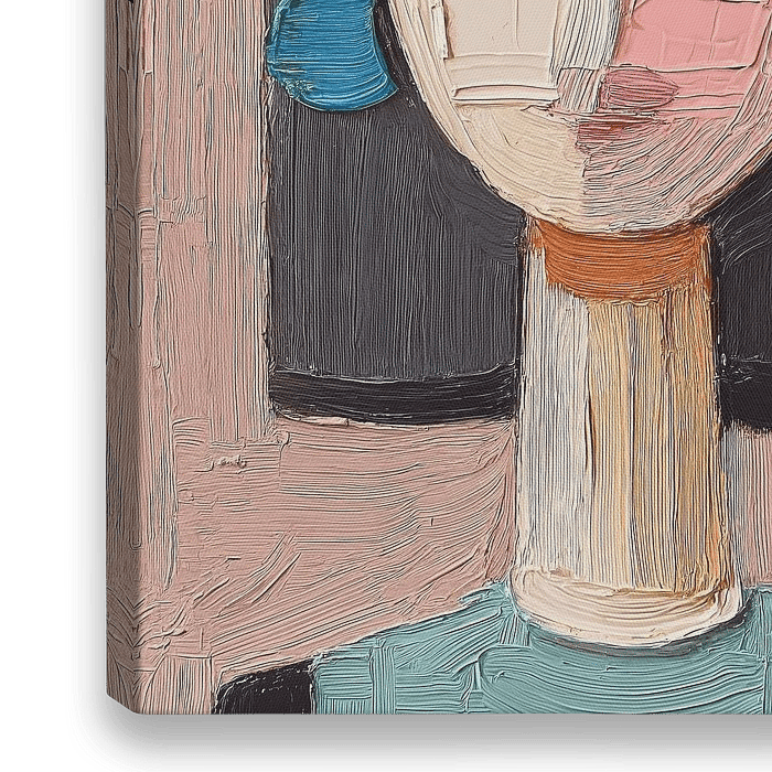 Een modern expressionistisch portret uitgevoerd in dikke impasto-techniek met een opvallend kleurenpalet van pastelroze, crème, grijs en turquoise. De compositie toont een gestileerd gezicht met kenmerkende blauwe oorbellen, waarbij de textuur van de verf een prominente rol speelt in de artistieke uitdrukking. De achtergrond in zacht…