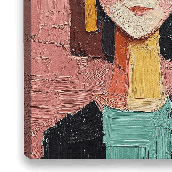 Een expressief olieverfschilderij met dikke verfstreken toont een verstild portret tegen een roze achtergrond. De compositie wordt gekenmerkt door een modern kleurenpalet met turquoise, geel en diepe contrasten. De gesloten ogen en serene uitdrukking creëren een intieme, contemplatieve sfeer, terwijl de asymmetrische oorbellen een…