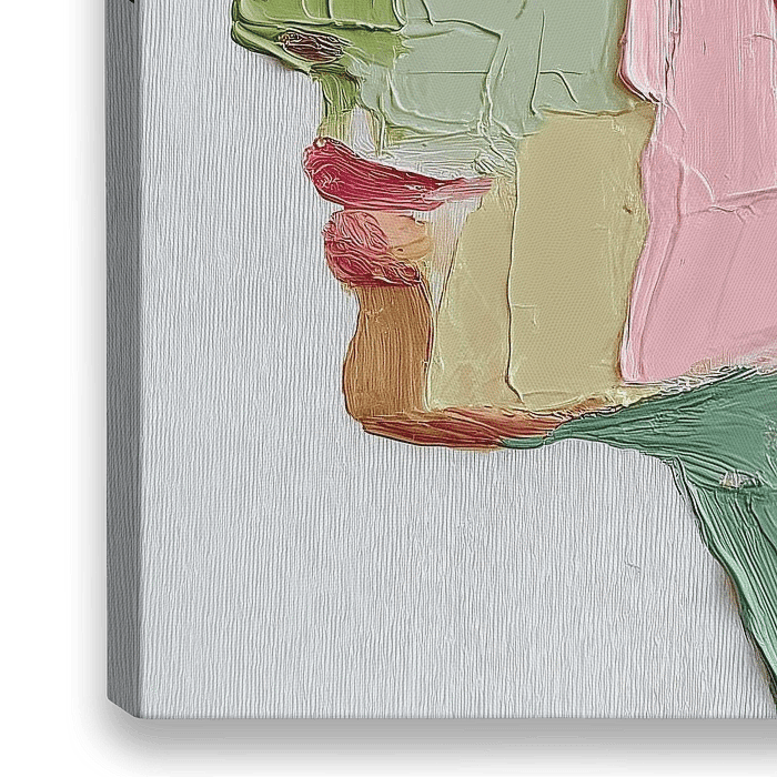 Een expressief olieverf portret in profiel, uitgevoerd in zachte pasteltinten van roze, mint en zachtgroen. De dikke verfstreken creëren een moderne, abstracte interpretatie waarbij de textuur van de verf een hoofdrol speelt. De compositie toont een krachtig zijprofiel dat zich aftekent tegen een witte achtergrond, waarbij de…