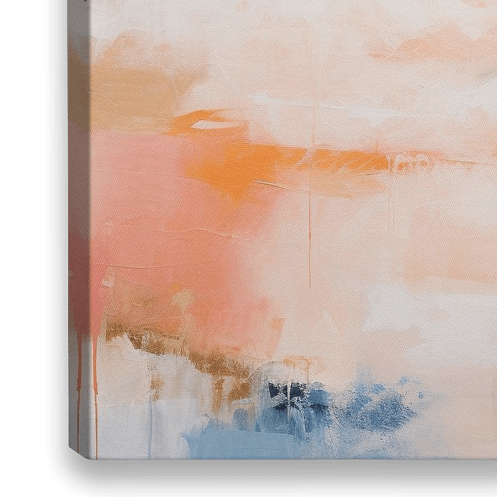 Abstract Landschap | Abstracte Kunst - Op dit doek prijkt een abstract spel van zachte, harmonieuze kleuren die samenvloeien tot een rustige uitstraling. Het subtiele gebruik van 'Peach Fuzz' voegt een warme gloed toe, perfect in balans met de koele blauwtinten en neutrale witten die ruimte en licht suggereren.