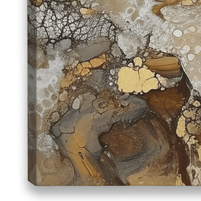 Abstract Marmer - Dit schilderij spreekt in fluisterende aardetinten met een abstract design dat doet denken aan een natuurlijke rotsformatie of een marmerpatroon. De organische vormen en delicate adering creëren een rustgevend maar ook intrigerend beeld, verrijkt door de subtiele glans van gouden accenten die het licht vangen. Het…