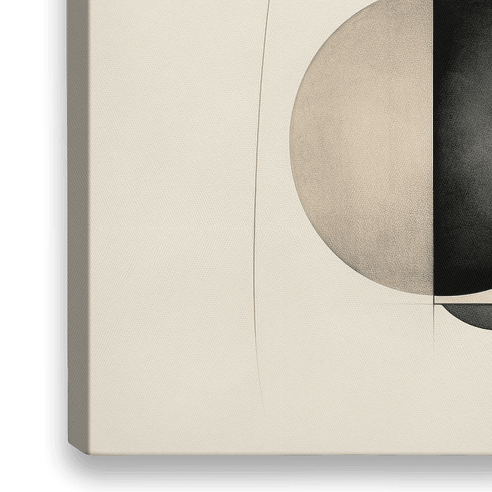 Abstract Minimalisme - Op het doek zie je een spel van abstracte vormen met een Japanse touch, waarbij geometrische en organische lijnen naadloos in elkaar overgaan. De subtiele kleurenpalet bestaat uit neutrale beige en zachte zwarte tinten, doorbroken door een warme terracotta cirkel, wat het geheel een serene en toch speelse sfeer…
