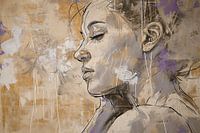Abstract Portret Reflectie - Dit schilderij toont een sierlijk vrouwportret in aardse tinten, subtiel contrasterend met accenten van lavendelpaars. De mix van ruwe penseelstreken en fijne lijnen geven het werk een intrigerende textuur en dynamiek, terwijl druipschilderingen zorgen voor een vleug van spontaniteit en…