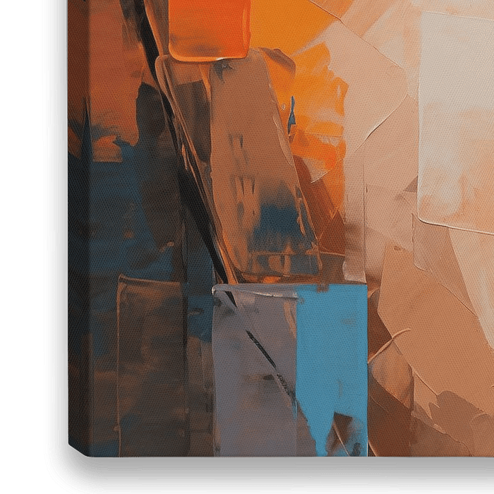 Abstract Portret - Het kunstwerk toont een portret van een vrouw met een focus op haar ogen, gestileerd in een moderne, abstracte manier. De krachtige penseelstreken en geometrische vormen vormen samen een dynamisch en expressief geheel, waarbij warme aardetinten harmoniëren met heldere accenten van oranje en blauw.