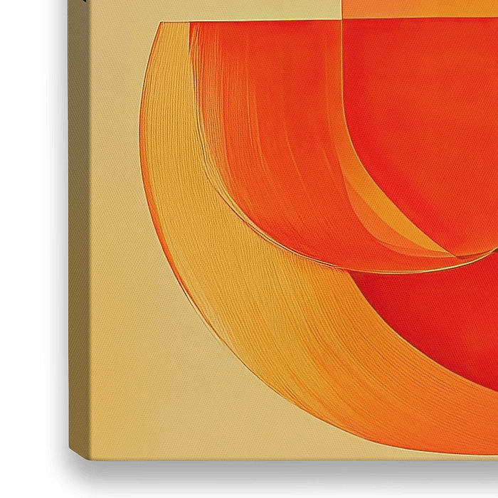 Abstract Rond - Dit abstracte schilderij kenmerkt zich door grote, naast elkaar geplaatste cirkelvormige elementen met een levendige combinatie van oranje en rode tinten, die elkaar overlappen tegen een zachtgele achtergrond.
