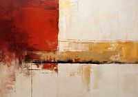 Abstract Rood | Layers of Time in Color - Dit abstracte schilderij kenmerkt zich door een krachtige, brede strook rood aan de linkerzijde, die contrasteert met brede zachte banen van beige en crème rechts, doorsneden door een subtiele horizontale gouden lijn.