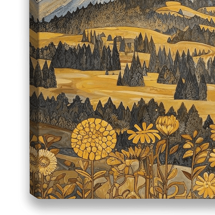Een krachtig en warm berglandschap wordt op een abstracte manier weergegeven in dit werk. De compositie wordt gedomineerd door gelaagde bergtoppen in een palet van gele tinten. De zichtbare, rijke textuur geeft het beeld diepte en een expressief karakter. Het is een indrukwekkende en sfeervolle blikvanger, ideaal om een gevoel van…
