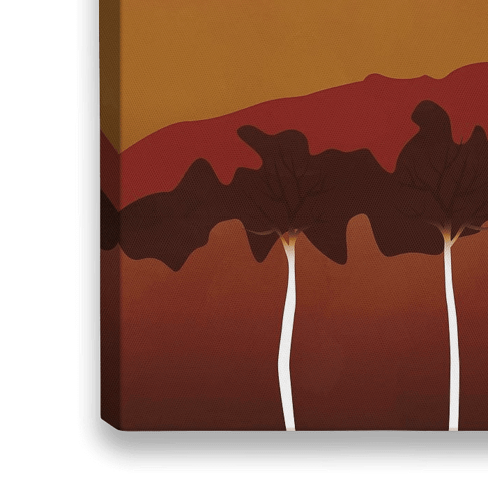 Een sfeervolle, minimalistische illustratie van een herfstlandschap in warme tinten. De voorgrond toont de silhouetten van drie bomen, met een vorm die subtiel verwijst naar wortels in diepe, donkere aarde. Daarachter liggen velden in tinten van oranje en rood. De achtergrond wordt gevuld door een rij kleurrijke bomen in schitterende herfstkleuren van oranje, rood, geel en groen, geplaatst tegen een lichte achtergrond. Het geheel straalt een harmonieuze balans van licht, schaduw en levendige herfstkleuren uit.