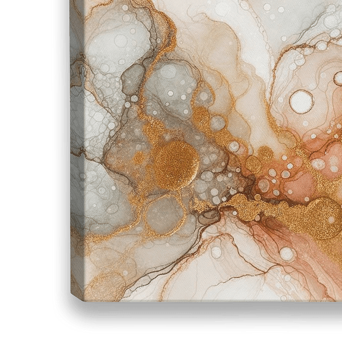 Abstracte illustratie in alcohol inkt in zacht roze perzikachtige en gouden kleuren gemaakt met A. I. en daarna bewerkt met Photoshop.